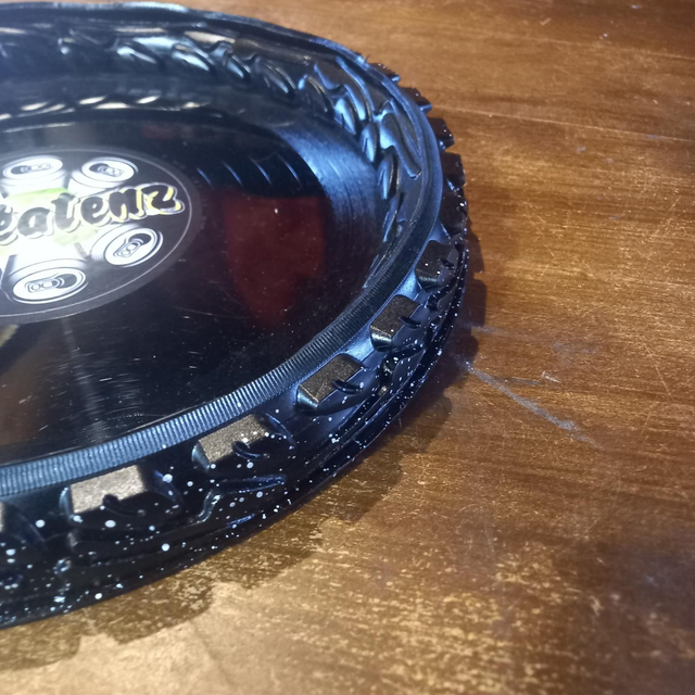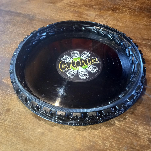 C'est un plateau de dés réalisé avec un disque vinyle 33 tours et du pneu de velo pour faire le contour.